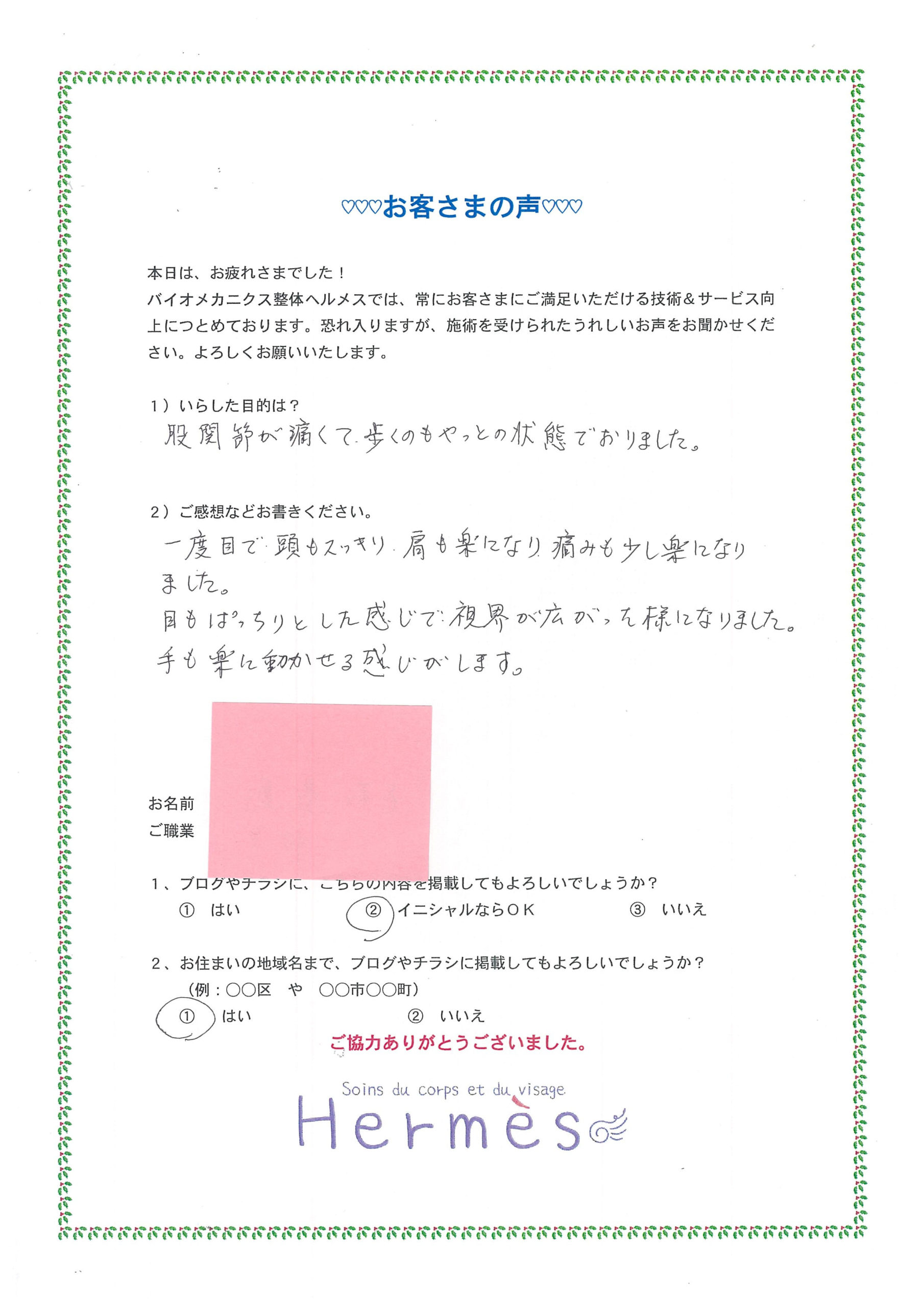 股関節痛、3年前からお悩み、というお客さまが、いらっしゃいました。ご感想を書いていただきました。