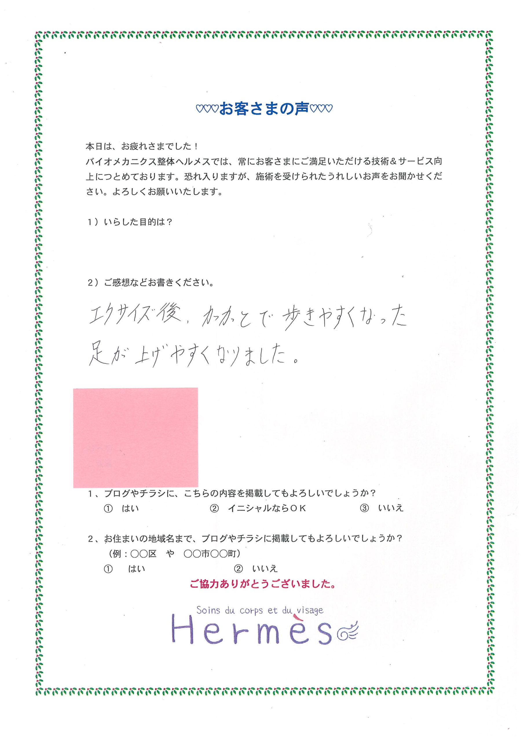 ”自分で自分の体、良くしていこう♪+エクササイズ”、というメニューになります。ご感想書いていただきました。