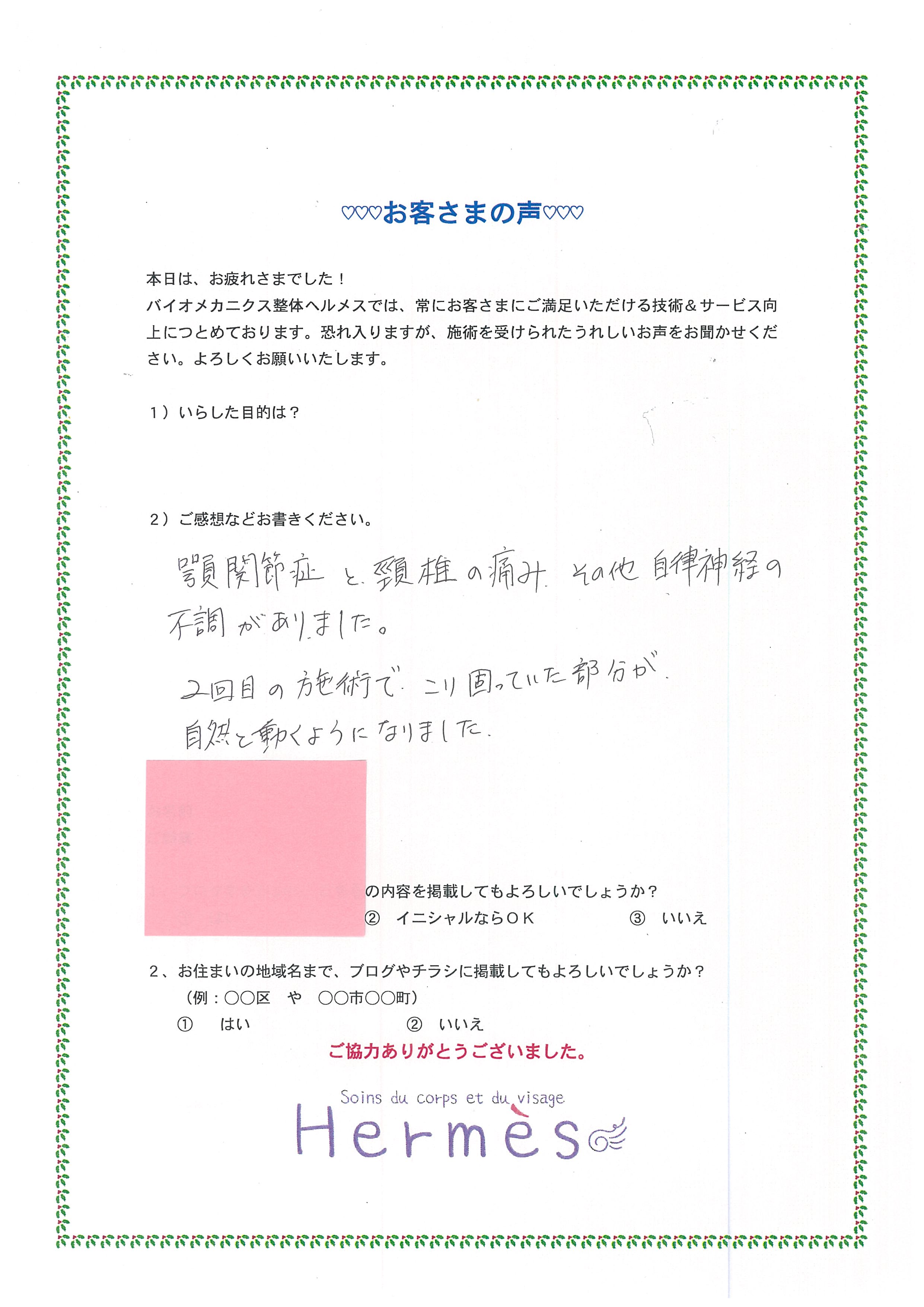 小学生のころ、頭を打って、22歳ごろから顎関節症のお悩みに、以来ずっと不調を抱えてらした50代のお客さま、毎回施術後、体のラクさに驚かれてらっしゃいます。