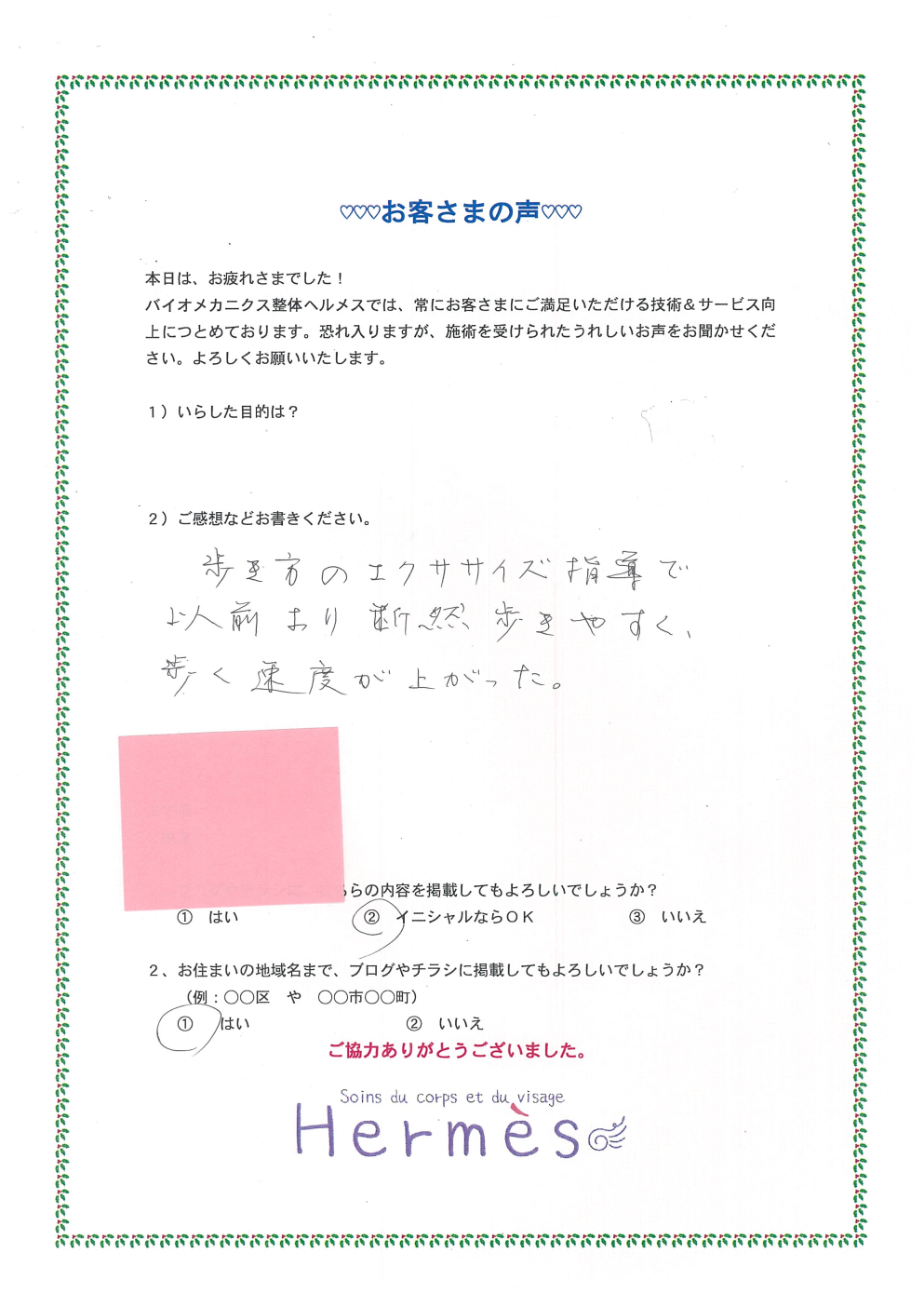 見るからに、歩き方が変わられ、颯爽と歩かれるように!良かったです。