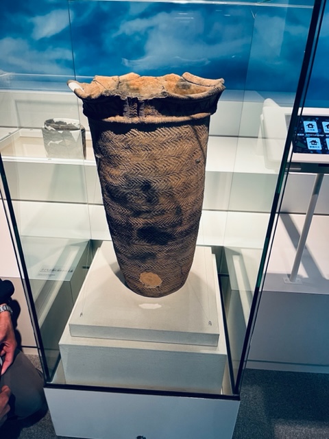 有名な縄文ポシェット。針葉樹(ひば)の樹皮製。くるみを入れていたそう。