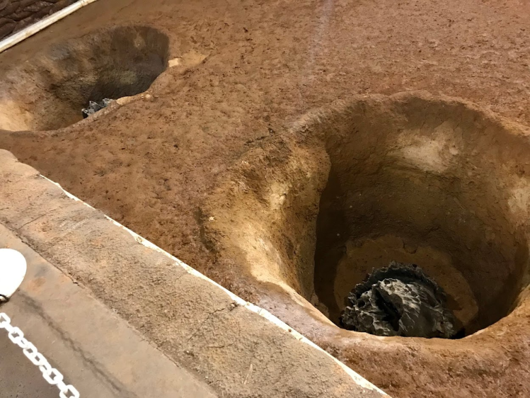 柱跡を覗き込みますと、このように。直径1メートルの栗の柱、しかも左右の列の柱が、それぞれわずかに内側に傾くように建てられていたそうです。