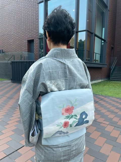 単衣の紬、袋帯も紬です。海辺のハマナス。