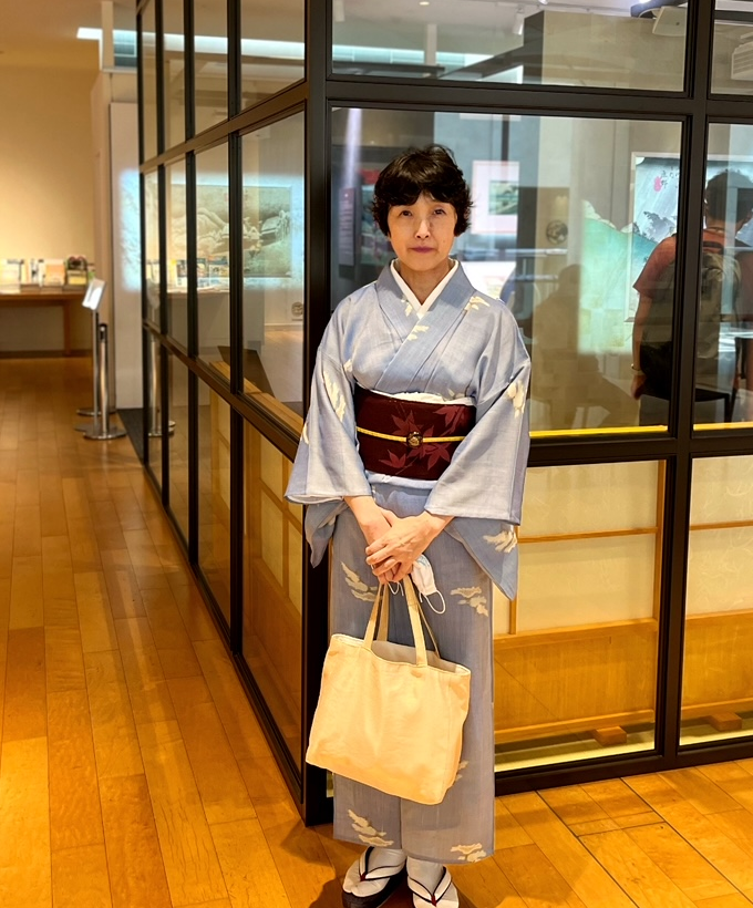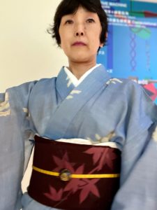 私は水色の紗の小紋と紗のもみじ柄の名古屋帯で。
