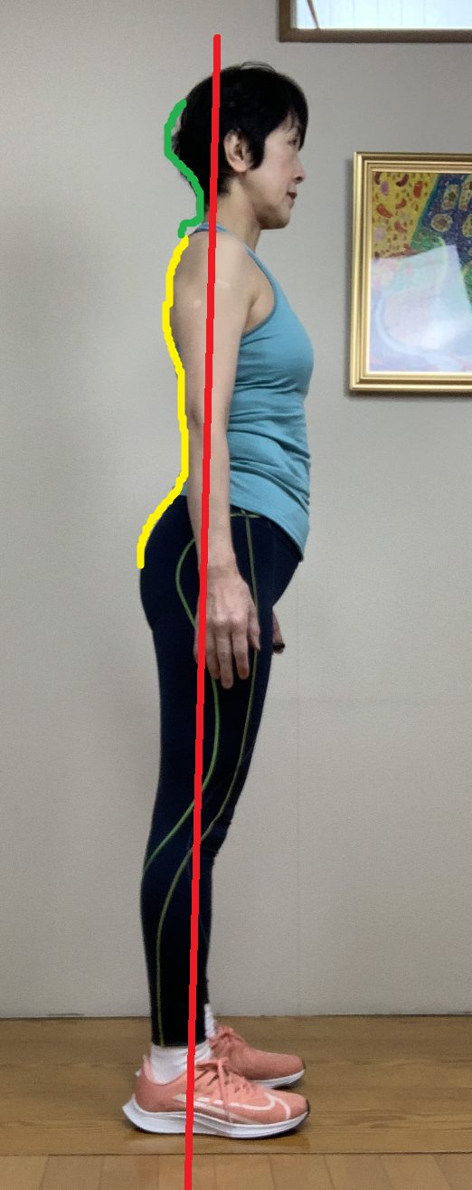 本来このように、床から、くるぶし、股関節、ヒジ、肩関節、耳を結ぶラインが垂直で、