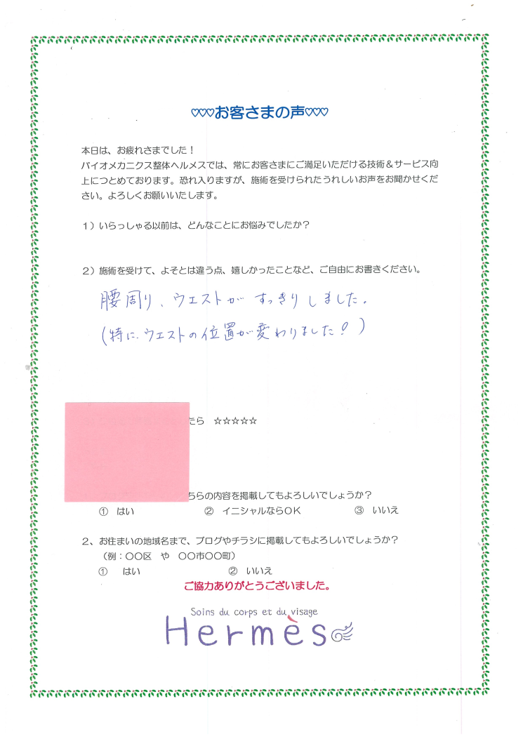 施術5回で、ウエストがすっきり!位置もキレイに!