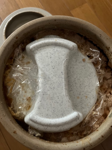 梅雨明けには、味噌返しします。味噌ツボ内のお味噌の上下を入れ替える、そんな作業です。
