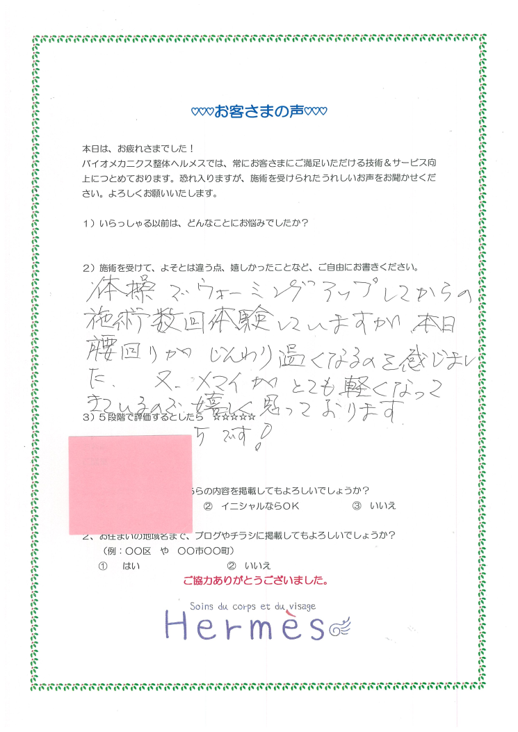 体操でウォーミングアップしてからの施術数回体験してますが、本日、腰回りがじんわり温かくなるのを感じました。