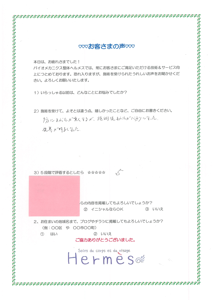 40代男性に、初めての施術のご感想書いていただきました。