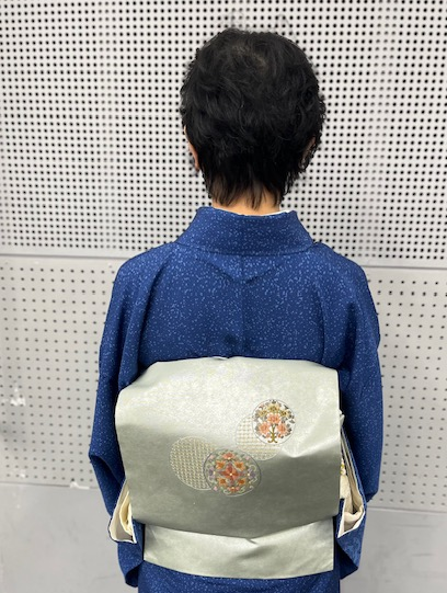 青い流水文様の、仰々しくない訪問着で。でもこの大好きな銀箔刺繍の帯は、袋帯でなくって名古屋帯。