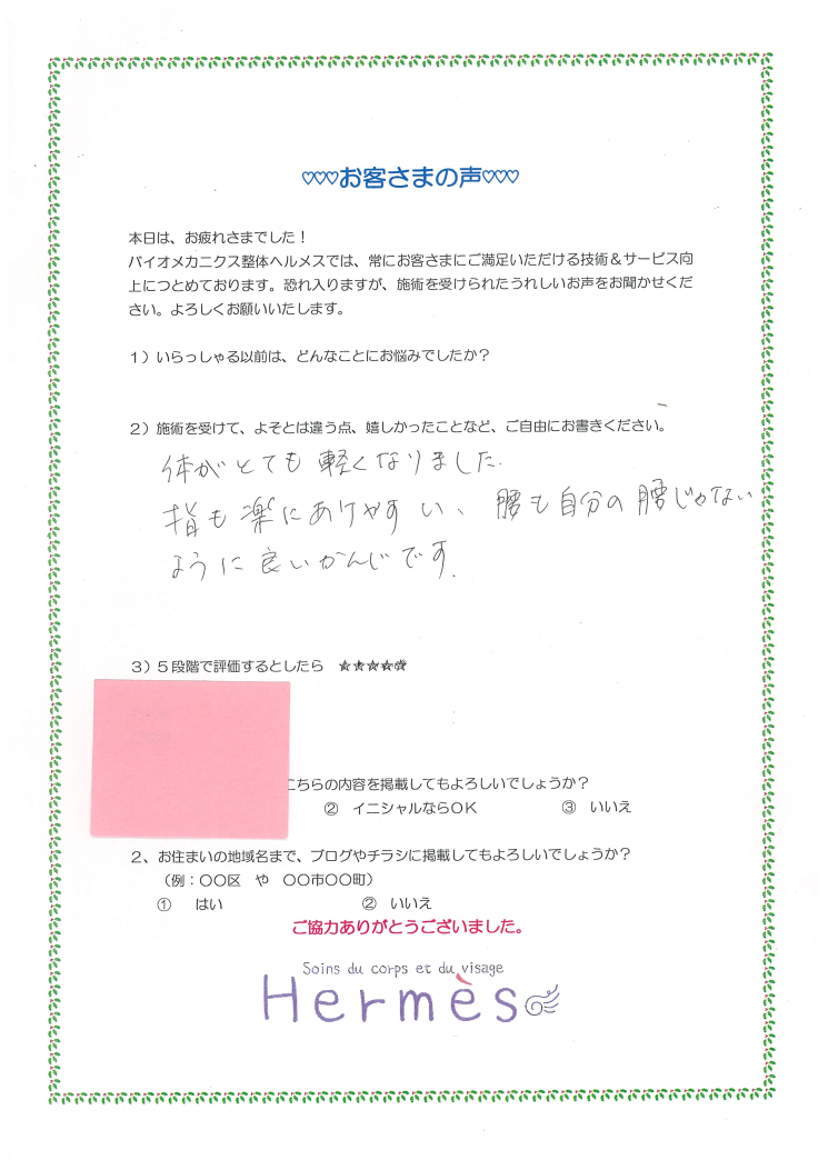 ずっと接骨院に通われてらしたそう。首腰のラクさが全く違う、とのことでした。