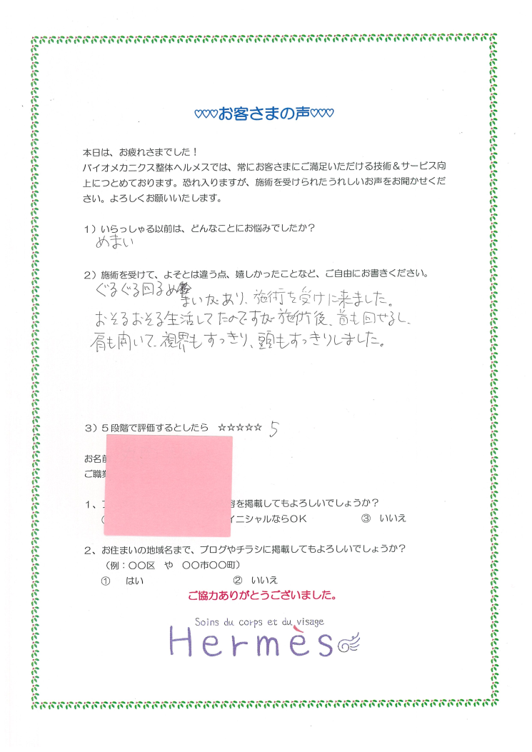 めまい・・・施術後スッキリ、めまい起こりそうにない!