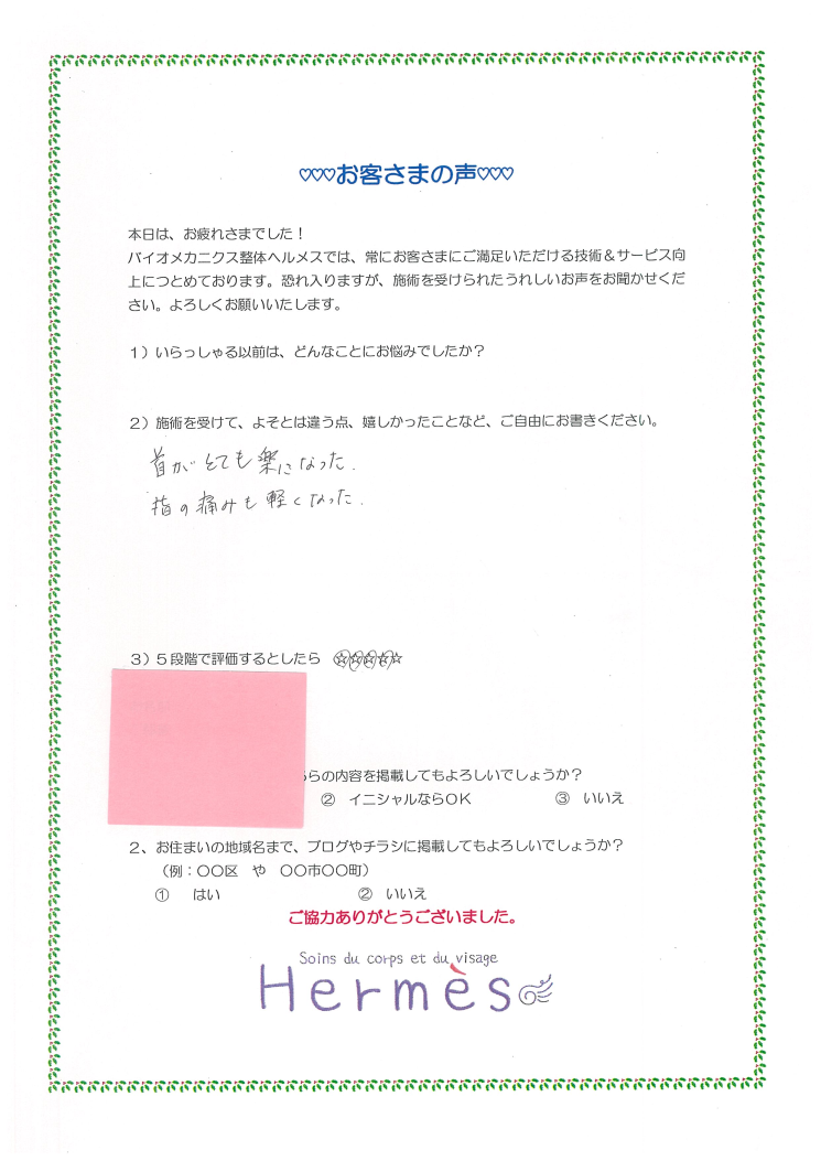 初めての施術に見えて、「首がラク!」と驚いてらしたお客さま、ご感想書いていただきました。