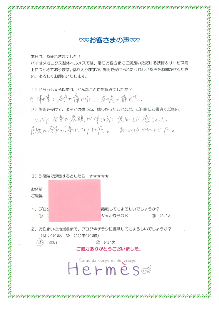 疲れやすくて困ってましたが、施術中から、一気に全身軽くなった!鉗子分娩の影響!?