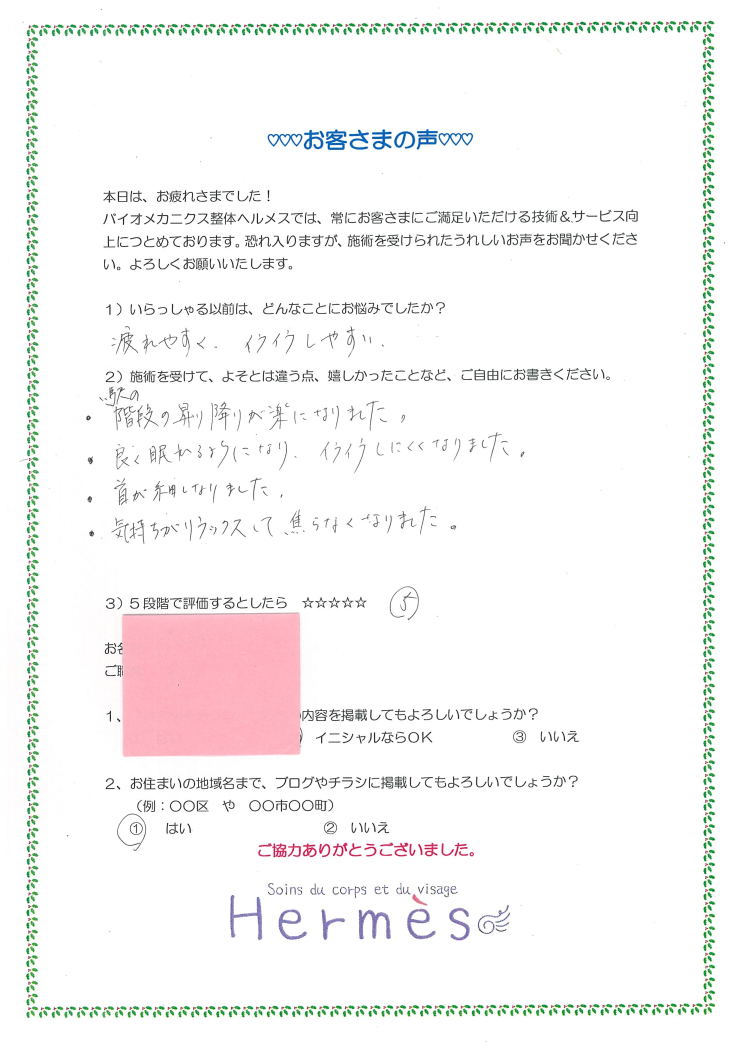 2回目にいらした際に、「もう階段上がるのがラクになって!」と話してらしたので、3回目の施術後、ご感想書いていただきました。