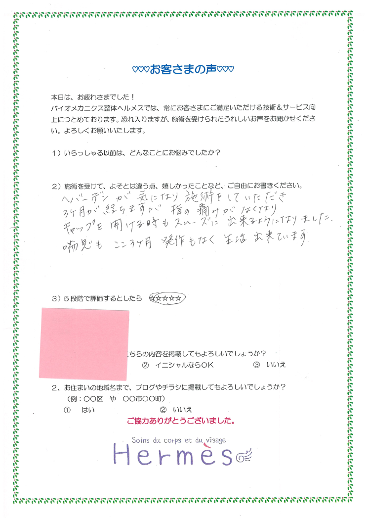 ヘバーデン結節、3か月で痛みなくなった!とのこと。ヘバーデン結節、どうにもならないのでは、と心配されてる方が多いので、近ごろこうしたご感想書いていただいてます。