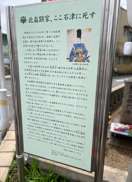 足利尊氏との戦いに、勝利を重ねたものの、1338年5月22日、こちら石津の戦いに敗れ没したそうです。