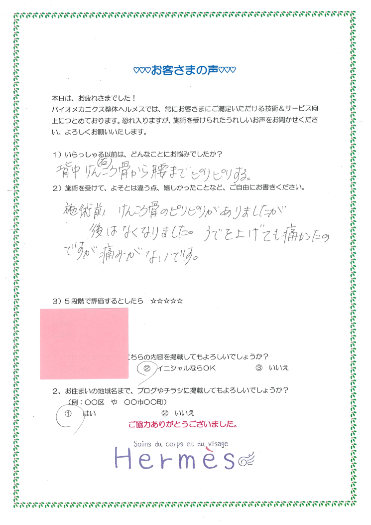 2)施術前、肩甲骨のピリピリがありましたが、施術後はなくなりました。