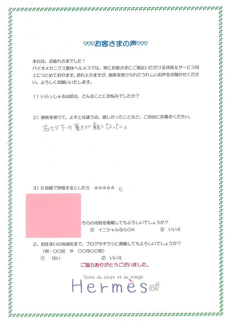 前腕の重み痛みがラクになられたお客さまに、ご感想書いていただきました。