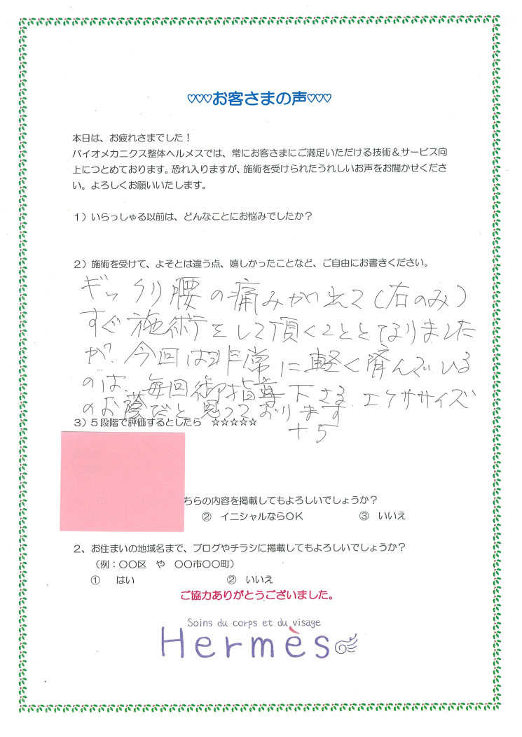 ぎっくり腰の痛みが出て(右のみ)すぐ施術をしていただくこととなりました。