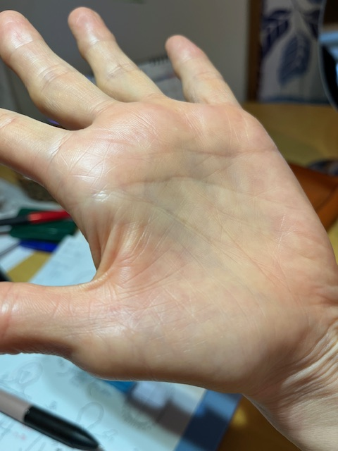 なかなか写真で再現しづらいのですが、手のひらがピカピカしている様子、わかりますでしょうか?