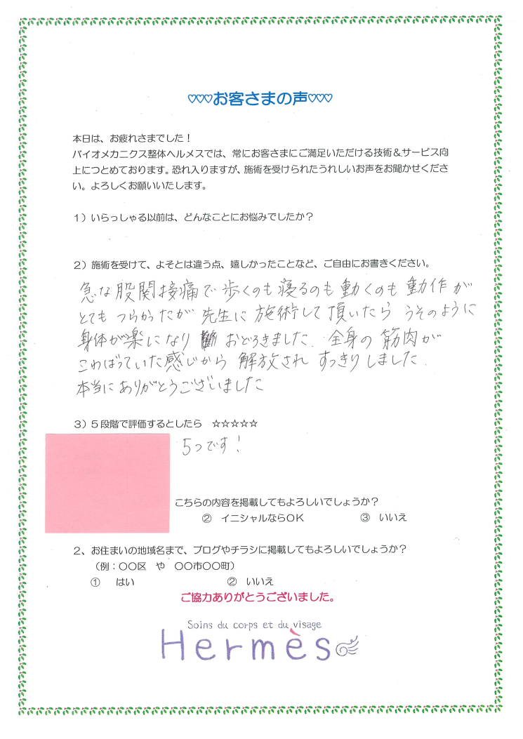 股関節が痛くて歩くのもツラい!というお客さま、お見えになられました。