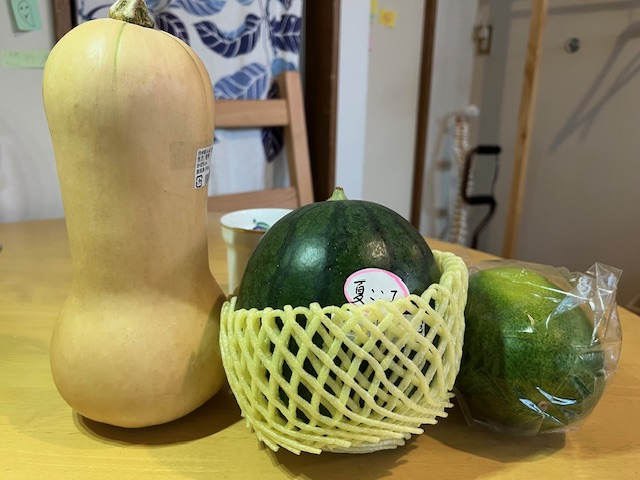 左から、ピーナッツカボチャと、スイカ(夏ここあですって!)そして冬瓜と。