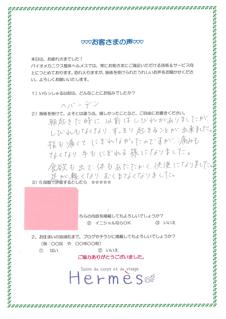 ヘバーデン結節で来たけれど、痛みなし!指も握れる!便秘も解消!足のむくみもラク!