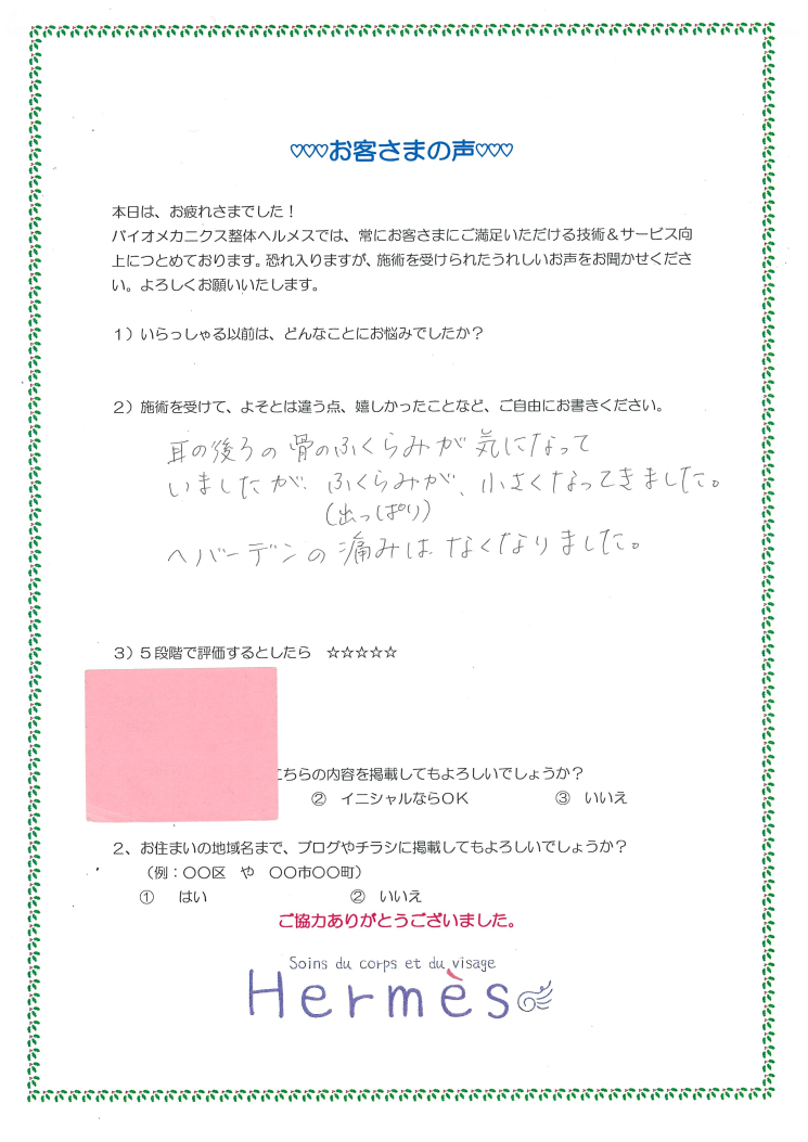 ヘバーデンの痛みなくなって!耳の後ろのふくらみ、小さくなった!