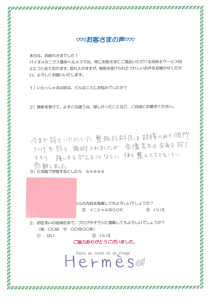 整形外科では、故障のある箇所だけの施術だったけれど、こちらでは、全身を強い力を加えずに整えている、そこに感動したとご指摘いただきました。