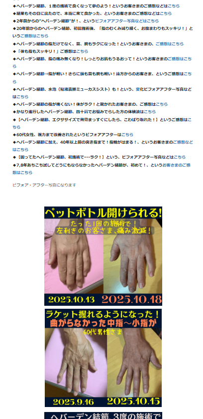 私共では、通ってくださってます皆さま、ヘバーデン結節、ブシャール結節改善されてます(まとめたものは、こちら