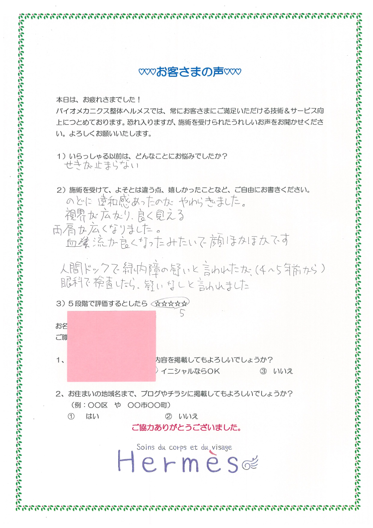 セキ・鼻水・頭痛・肩ヒジの痛み⇒のどの違和感減り、頭も体もスッキリ