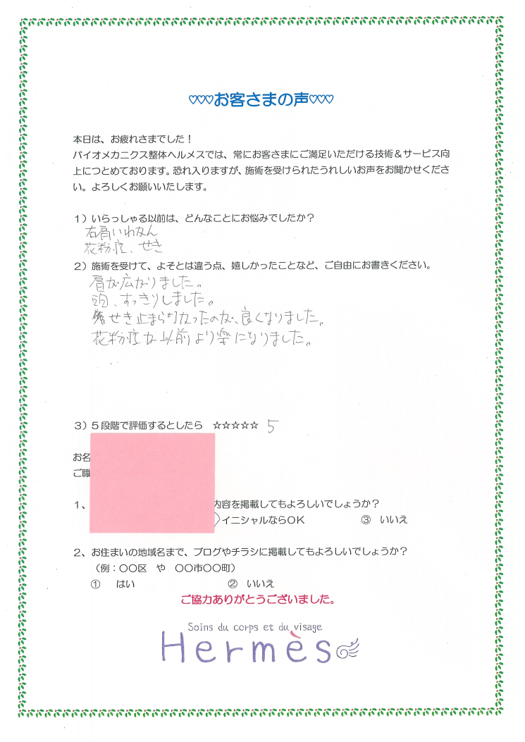 1)お悩みは 右肩の違和感、花粉症、せき