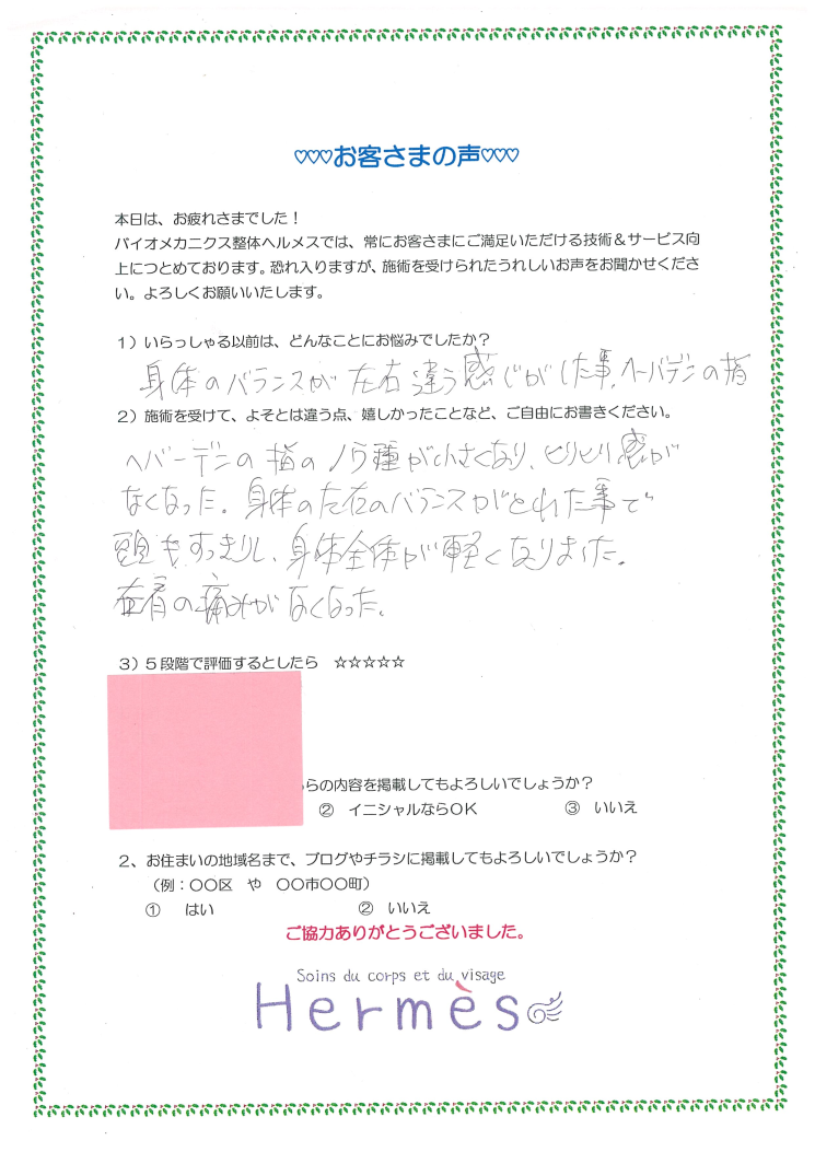 身体の左右のバランスが取れた事で、頭もすっきりし、身体全体が軽くなりました。