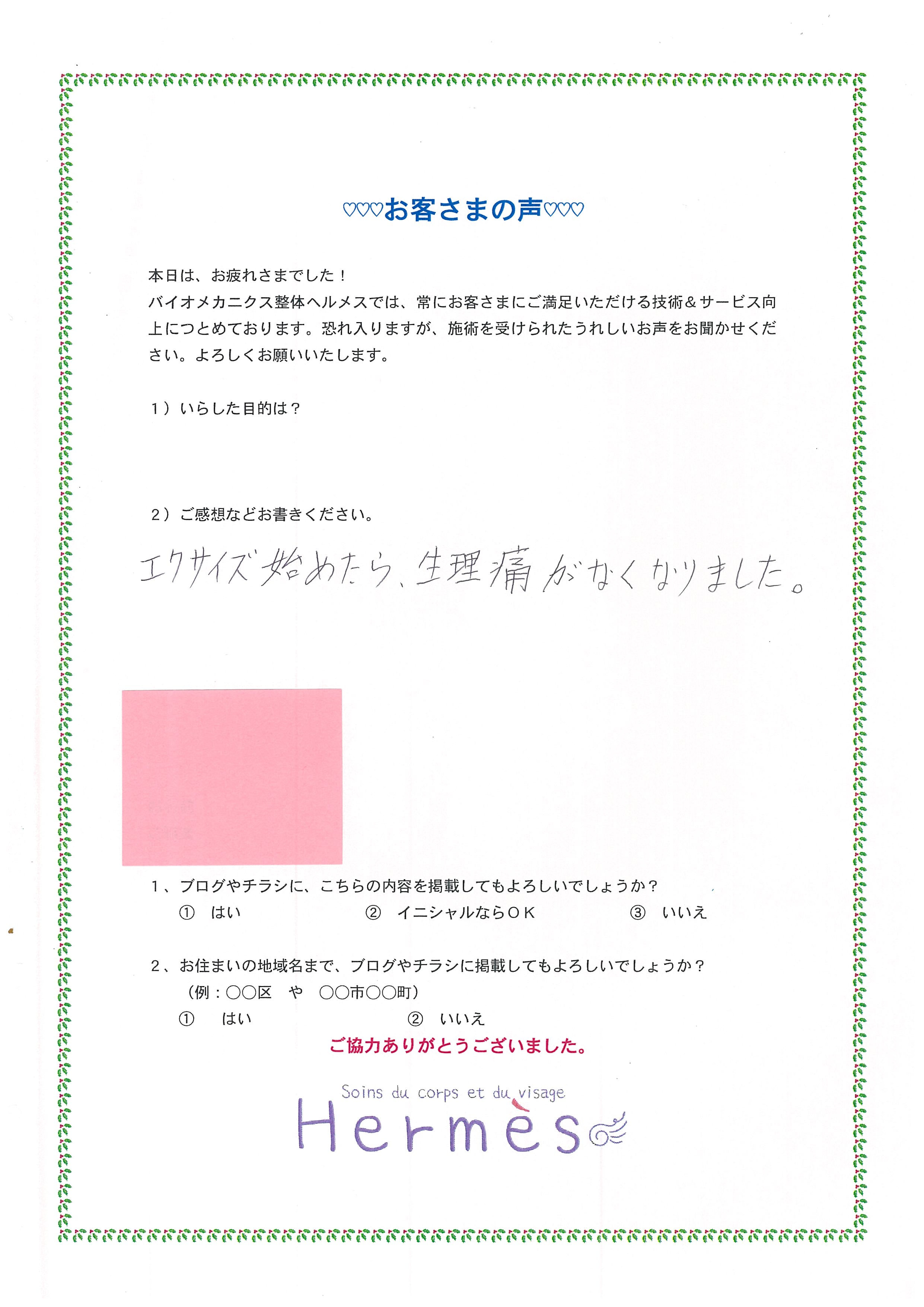 まず、1)私共に通われるようになってから、もどしてしまうほどの生理痛が、改善。もどすことはなくなられたそうです。