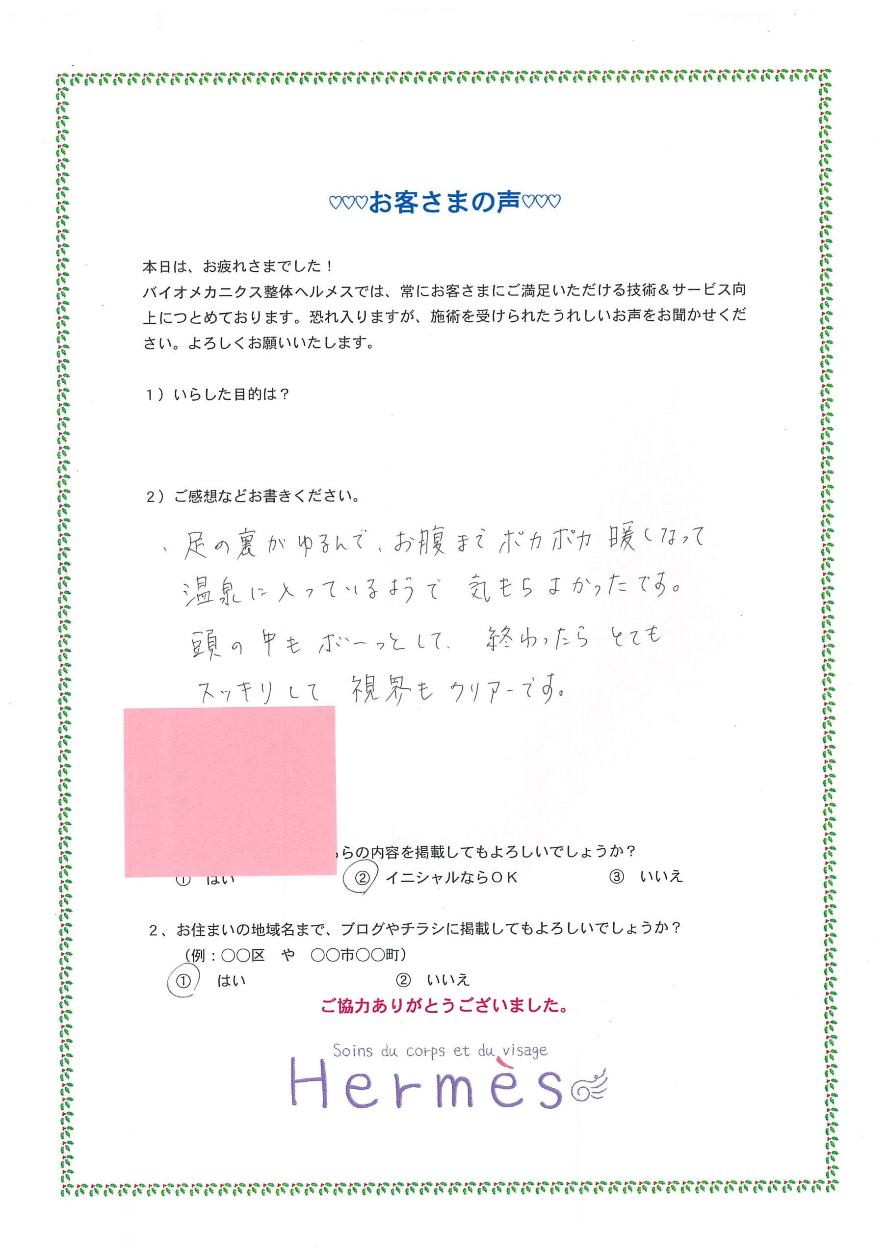 足の裏がゆるんで、お腹までポカポカ暖かくなって、温泉に入っているようで、気持ちよかったです。