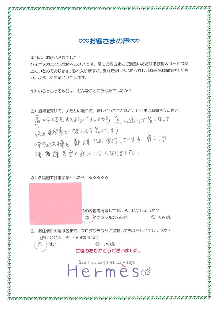 今まで呼吸がつらかったのですが、楽に落ち着いてできるようになり、気持ちも大変安定しています!!!